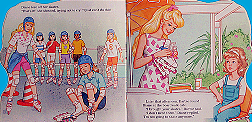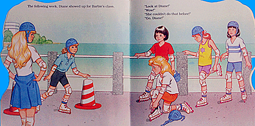 Go, Barbie! In this picture-book adventure, she's everyone's favorite rollerblader, and now she's coaching a group of younger girls. Practising on a section of seaside boardwalk, everyone in Barbie's class does well but one. A girl named Diane falls again and again and is too discouraged to continue. After a few weeks of special coaching by Barbie, Diane dares to return to the boardwalk -- and shows a lot of progress. Go, Diane! And thank you, Barbie.