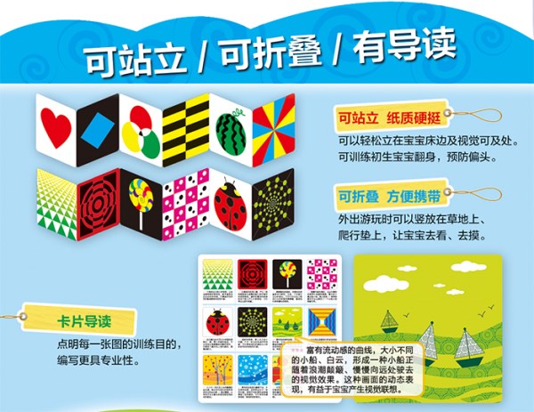★可站立,纸质硬挺。可以轻松立在宝宝床边及视觉可及处。可训练初生宝宝翻身,预防偏头。