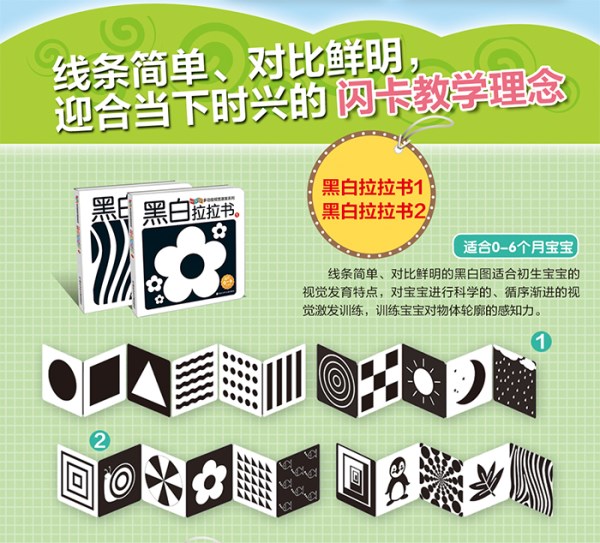 第一阶段:使用黑白拉拉书1视觉点状图、黑白线条图等进行训练,可为宝宝提供良好的视觉刺激进而促进宝宝的视觉发育,强化宝宝的视觉认知,感知线条。