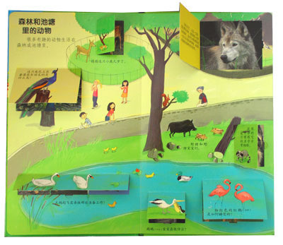 4.有趣的翻翻书形式+精美插图+真实照片,让孩子领略真实自然风光,认识海滨、乡野等不同地方的有趣动物。