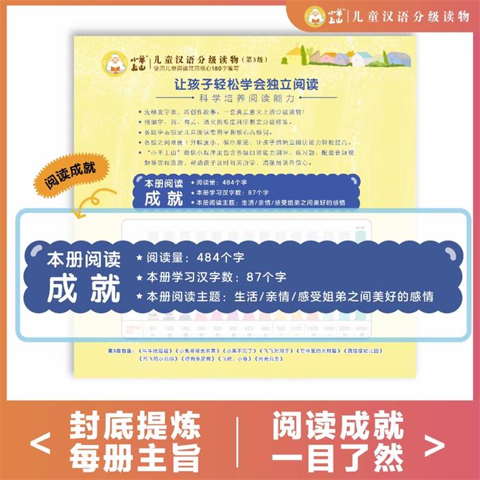 《小羊上山儿童汉语分级读物》是汉语分级读物领军人孙蓓老师联合国内一线教育专家、成熟绘本作者和插画师为3~9岁处于识字、阅读敏感期的孩子匠心编写的中国原创汉语分级读物书系。本系列依据新版小学语文课程标准,根据字、词、句式、语义的难度科学制定分级标准,先用儿童阅读常用字和核心高频词设定各级字表,后创作全新图画故事,以帮助孩子掌握正确的阅读方法,轻松学会独立阅读,科学培养阅读能力。丛书根据孩子的阅读字量范围分为14个级别,其中前8级为学龄前儿童阅读字量,后6级为小学1-3年级儿童阅读字量。全套丛书拥有完整、完善的线上、线下辅助学习体系,线下附赠有家长指导手册,线上提供小羊上山微信小程序,为每一位读者提供海量的线上资源,