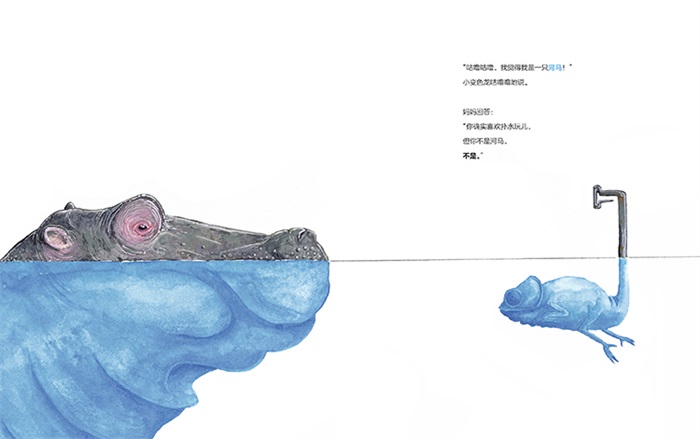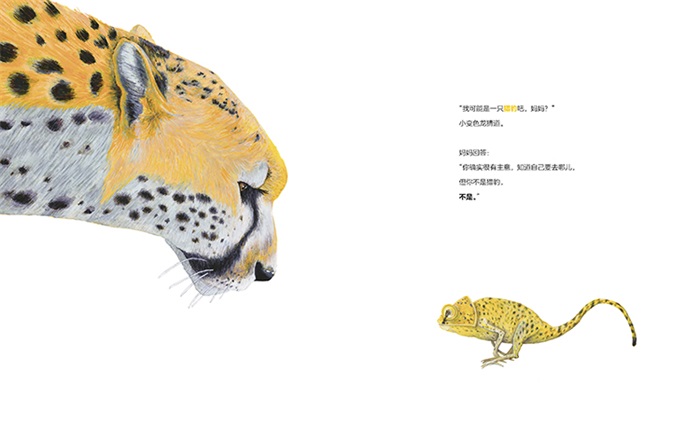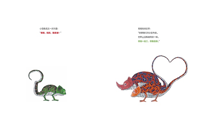 法国“父母想送给孩子的书”优xiu奖(法国索姆省图书馆给所有新生儿的出生礼) 当孩子问“我是谁”的时候,其实并不是真的想知道这个问题的答案,而是想获得爸爸妈妈的肯定与珍视 爸爸妈妈无条件的爱,让孩子获得自信、勇于探索世界 小变色龙和其他动物的有趣对比,激发孩子的观察、联想与思考力 引导孩子坦然接受自己与他人的相同与不同,就算跟别人一样也没关系,就算跟别人不一样也没关系,你就是你