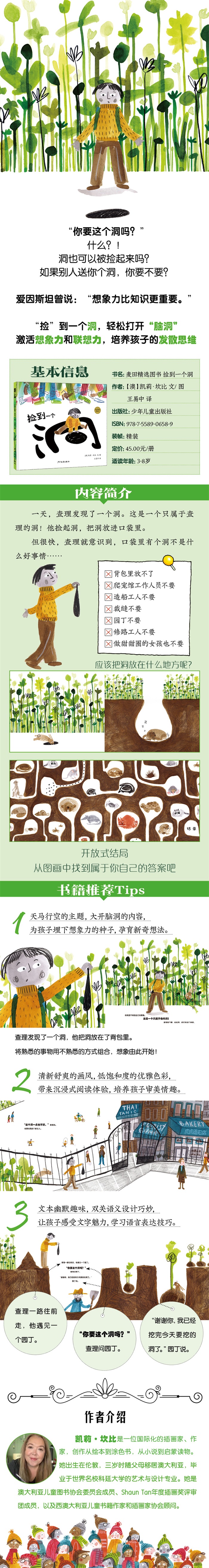 《洞的故事》既有现实意义,又富有孩童的想象力。故事从主人公查理发现一个洞开始,然后围绕不同人的工作属性,阐述这个人对于“洞”的态度。它能引导我们的孩子用思辨的眼光去看待事物。所有人都不需要的“洞”,是谁的天大惊喜呢?