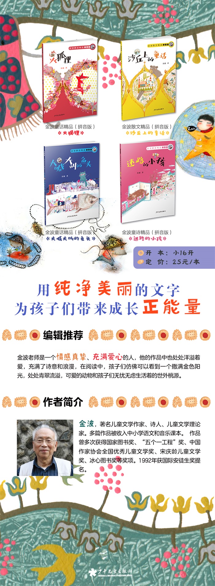 金波老师是一个情感真挚、充满爱心的人,他的作品中也处处洋溢着爱。再加上作者的诗人身份,更使这些童话充满了诗意和浪漫,读金波老师童话,孩子们仿佛可以看到一个撒满金色阳光,处处青翠流溢,可爱的动物和孩子们无忧无虑生活着的世外桃源。