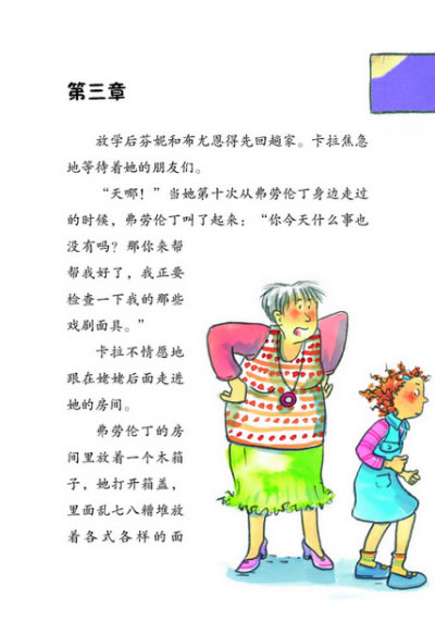 全套作品共6册,故事轻松活泼,语言清新俏皮,插图精美。《宠物日风波》卡拉的班级要举办一次不同寻常的宠物日活动,卡拉告诉大家她有一只“迷你小老虎”。可是到哪儿去找呢?幸好有姥姥弗劳仑丁帮忙!《神秘来客》 亚马逊网站五星图书。夜晚,一阵奇怪的声响把卡拉从梦里吵醒——邻居在满月的夜晚为什么会唱那首奇怪歌?卡拉和朋友芬尼、比奥开始调查这件事。姥姥弗劳仑丁和这件事有什么关系?