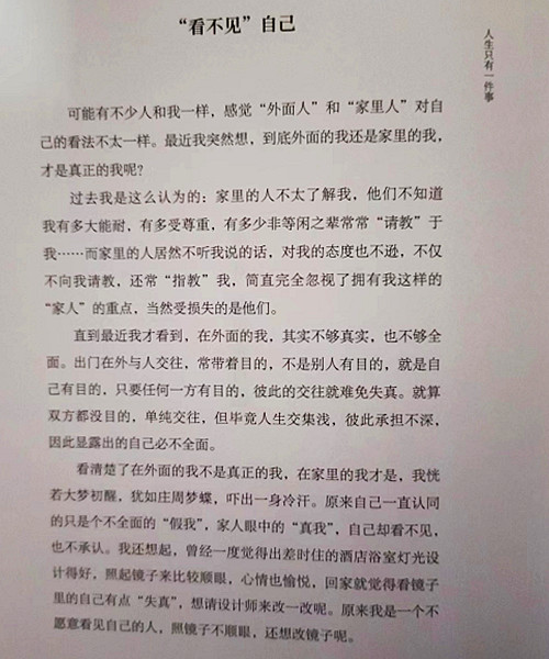 人生只有一件事 人生到了一个阶段,开始越来越简单,也更能体会“大道至简”的真义。简单到后,只剩一件事,就“近乎道”了。这件事,也只有两个字:活好! 既然生而为人,当然没道理不“好好活”。这件事,人尽皆知。但我说的是:除了“活好”,人生没别的事。这就需要解释了。 人生苦乐成败,大约脱不了“关系”二字。在关系中,无论男女老幼、尊卑贵贱,其实只有两个念头。其一,叫作“我想不想跟你在一起?”其二,叫作“我想不想和你一样?”如果别人并非“不得不”,而是真心地想和你在一起、想和你一样,那么彼此的关系,应该就“没别的事”了。 举例来说,如果你家的孩子,是发自内心地想和你“在一起”,想和你“一样”,这样的孩子,应该是不用教的。他每天待在你身边,看你在想什么、说什么、做什么,就偷偷跟着学。他看你往东,他就跟着往东;看你往西,他也跟着往西。这样的孩子,还需要教吗?反之,如果他不想跟你在一起,更不想和你一样,你叫他往东,他偏要往西。原因也很简单,就是他不想和你一样嘛!这样的孩子,是没法教的。难怪德国教育学家福禄贝尔说:“教育之道,爱与榜样,除此无他。” 在工作中亦然,如果你的属下,都想和你在一起,想和你一样,你就不必“管理”他们了。否则必然大费周章,事倍功半。 在社会上的影响力亦然。如果你周围的人都想和你在一起,想和你一样,影响是自然发生的,不必刻意经营。这也许就接近经典上所说的“无相布施”了。 世界上影响的圣者,诸如孔老夫子、释迦牟尼、耶稣基督,经过了两千多年,还有数以亿计的人想和他们在一起,想和他们一样。这些人生不逢时,只好从经典中揣摩他们曾经活出的“样子”,想方设法活成一样。所以人生的意义,真的不是“想”出来的,只能“活”出来。人生除了活好,真的没有别的事。 一个活好的人,可以通过遇见的每个人、发生的每件事,让自己越活越好。所以发生的都是好事,遇到的都是好人,怎么可能有“分别心”呢?因为越活越好,所以人生当下的每一刻,都是好的时光,后必能含笑而去。除了活好,人生哪有别的事?忙别的事,都是庸人自扰。 讲了那么多,你难免会问我“活好了没?”,我的回答是:“还在学!”还在学“怎么活才会好!”活到老,学到老,也真的只有这件事。 从小事做起 少年时代,读到孙中山先生说:“立志做大事,不做大官!”我十分佩服,也立志要做大事。既立此志,我的处世原则自然发展为“大节不亏,小节不拘”。后来,虽然没做成什么大事,却变成十足不拘小节的人,也觉得没什么不好。