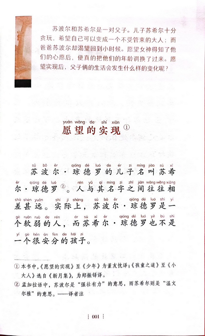 《愿望的实现》是印度著名文学家泰戈尔的一篇经典短篇童话。作者以幽默诙谐的笔调讲述了一对父子年龄互换的故事。儿子苏希尔贪玩,不爱学习,希望能快快长大,不再受人管束;爸爸苏波尔却渴望回到童年,用功读书。在愿望女神的帮助下,父子俩终于实现了愿望,互换了年龄。然而,年龄互换后,他们非但没有感到丝毫快乐和满足,反而陷入了一系列麻烦之中……作者借这个故事巧妙又深刻地传递出珍惜时间、换位思考等的主题思想,既令人发笑,又引人深思。除了《愿望的实现》外,本书还收录了《纸牌王国》《玩具的自由》《花的学校》《小大人》等泰戈尔经典的童话和儿童诗。其中的童话或诗意优美,或简朴轻快,都蕴含着深刻的道理;儿童诗则清新隽永、温柔真挚,表达出纯洁、恒久、美好的情感,值得我们每个人深入思考和品味。