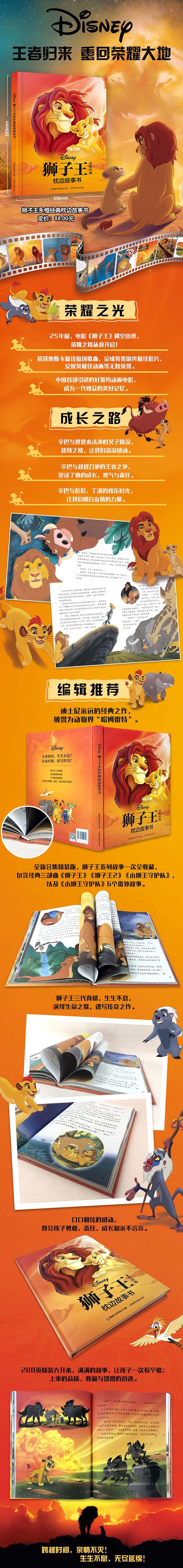 这是一本图画故事书。由狮子王、狮子王2和小狮王守护队等多个故事组合而来,是一本精装的合集。狮子王祖孙三代的故事,在这一本中,得到延续和传承,是喜欢狮子王的读者不容错过的故事合集,具有极好的收藏价值。本书选用精装大开本的装帧方式,哑膜加烫金,给读者品质之感。