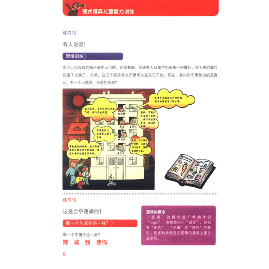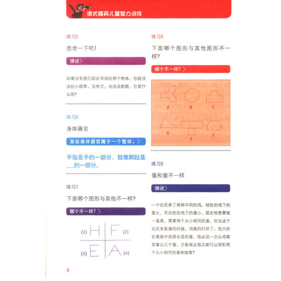 这本书里有推理、猜谜、找不同、立体图与平面图等多种题型,图文并茂,趣味多样,更棒的是,还有穿插其中的知识“小贴士”。还等什么?就让我们一起来体验德式精英儿童的智力训练法吧!