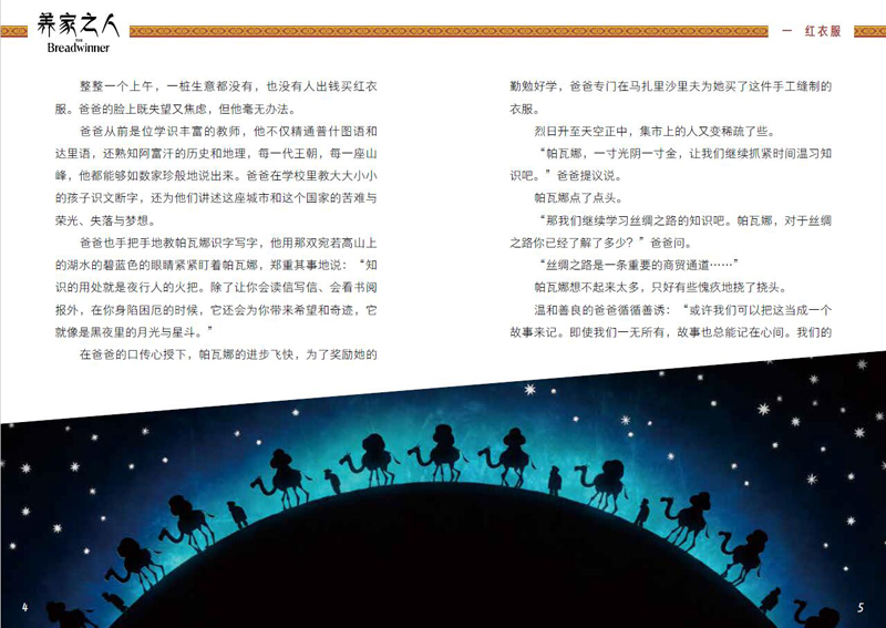 本书根据全球超强口碑及受欢迎动画工作室卡通沙龙制作的动画长片《养家之人》改编而成。11岁的阿富汗女孩帕瓦娜一家生活在塔利班的严酷统治之下,塔利班禁止任何女性在没有成年男性的陪同下外出。帕瓦娜的爸爸因教女孩认字的罪名被抓进监狱后,一家人的生活陷入困顿中。危难时刻帕瓦娜剪去头发,装扮成一个男孩,到集市上代人读信写信、购买食物,成为小小的养家之人。帕瓦娜还能见到爸爸吗?这一家人的命运将会怎样?