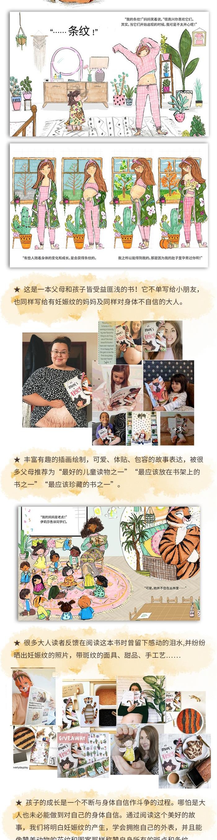 ★这是一本父母和孩子皆受益匪浅的书!它不单写给小朋友,也同样写给有妊娠纹的妈妈及同样对身体不自信的大人。 ★丰富有趣的插画绘制,可爱、体贴、包容的故事表达,被很多父母推荐为“好的儿童读物之一”“应该放在书架上的书之一”“应该珍藏的书之一”。 ★很多大人读者反馈在阅读这本书时曾留下感动的泪水。 ★孩子的成长是一个不断与身体自信作斗争的过程。哪怕是大人也未必能做到对自己的身体自信。通过阅读这个美好的故事,我们将明白妊娠纹的产生,学会拥抱自己的外表,并且能像赞美动物的花纹和图案那样称赞自身所有的斑点和条纹。