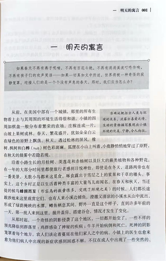 《寂静的春天》描述了人类可能将面临一个没有鸟、蜜蜂和蝴蝶的世界。作品以寓言开头向我们描绘了一个美丽村庄的突变,它既贯穿着严谨求实的科学理性精神,又充溢着敬畏生命的人文情怀,是一本赏心悦目的著作。本书主要依据课程标准推荐的阅读书目进行选择篇目。针对中小学生的阅读习惯、阅读理解能力,本书设置了一下主要内容。开篇导读:针对全书或各个篇章,从作品主要人物、故事情节、艺术特色等方面引导阅读,激发读者阅读兴趣,让读者轻松愉快地进入阅读最佳状态。疏通文字:对不易认读和理解的字词,进行随文注音和释义,扫清阅读障碍,让读者阅读更轻松。写作借鉴:对书中典型的写作借鉴点进行系统提炼并剖析。读者可以直观地对书中的写作亮点进行借鉴,提高写作水平。知识链接:对书中涉及到的天文、地理、民俗、科技、礼仪等知识进行链接,可拓宽读者视野,增长读者见识。考点精练:对书中的一些重点、难点、考点进行提炼,设置练习,可以引导读者深入理解内容,使阅读与考试评价接轨。