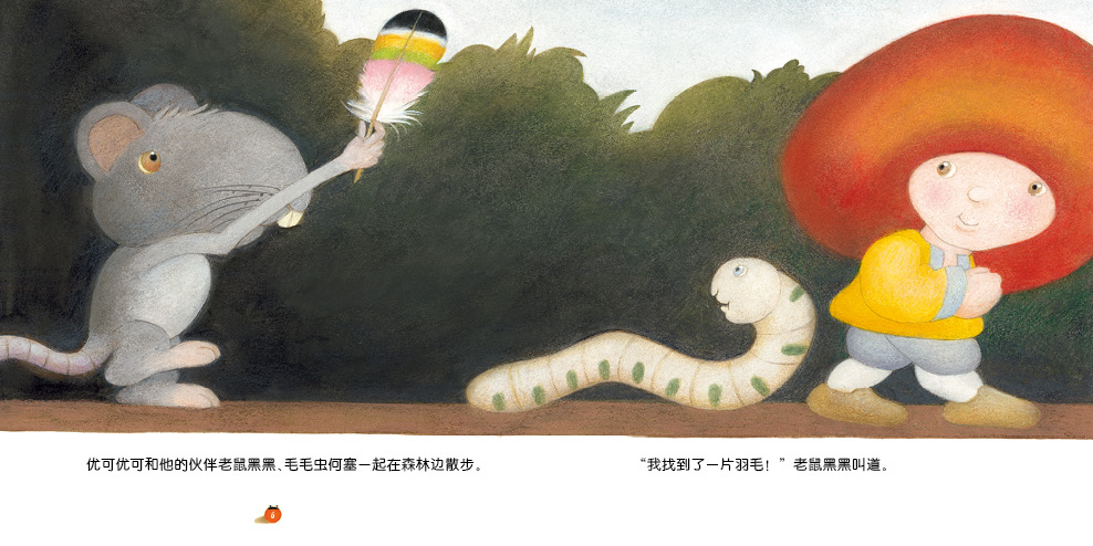 优可优可(Yok~Yok)来自一个被好奇的乌鸦啄开的核桃中。他是一个很老很老的、带着红色的蘑菇帽的精灵,被仙女在核桃里封印了近三十年。没有人知道它到底多大了,它有两个朋友,一个是黑鼠,一个是毛毛虫,他们一起走过了一段和自然共舞、与魔法同行的幽默旅程。一片羽毛悄悄飘落,它属于谁?不是你,不是我,难道是睡在天空中的它?