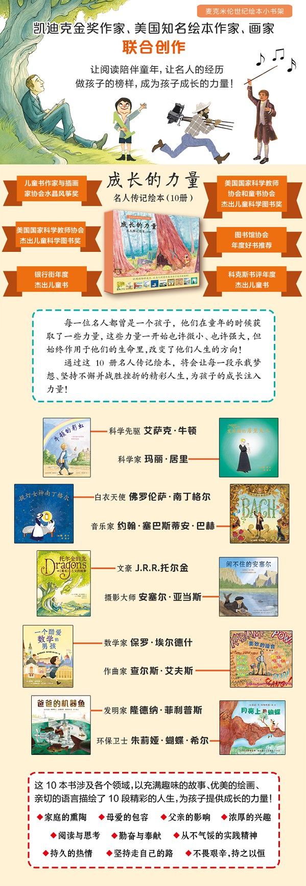 这套“成长的力量名人传记绘本”精心挑选了10册以多种领域的优秀人物为核心的成长故事类型的图画书,以高品质的内容含量、平装套装的形式奉献给成长中的孩子和家长。