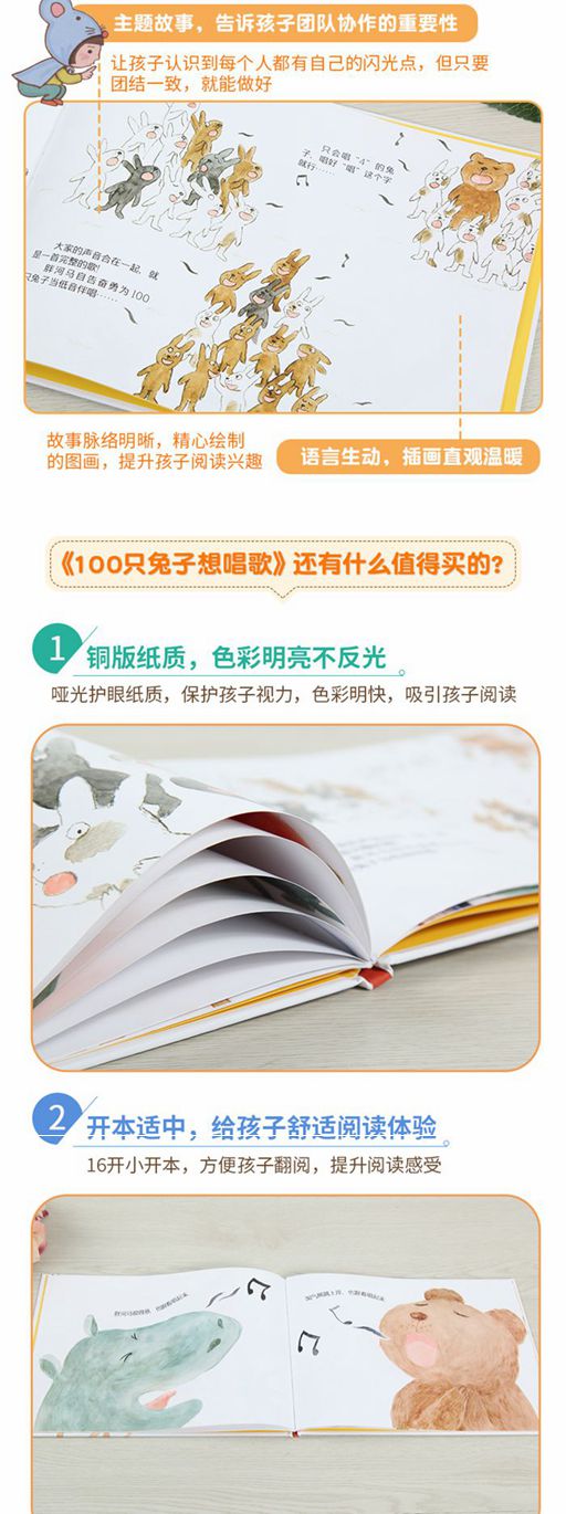 《100只兔子想唱歌/中国原创图画书》介绍了,这个特殊的合唱团在森林里巡回演出,结果又发生了多有趣的故事一