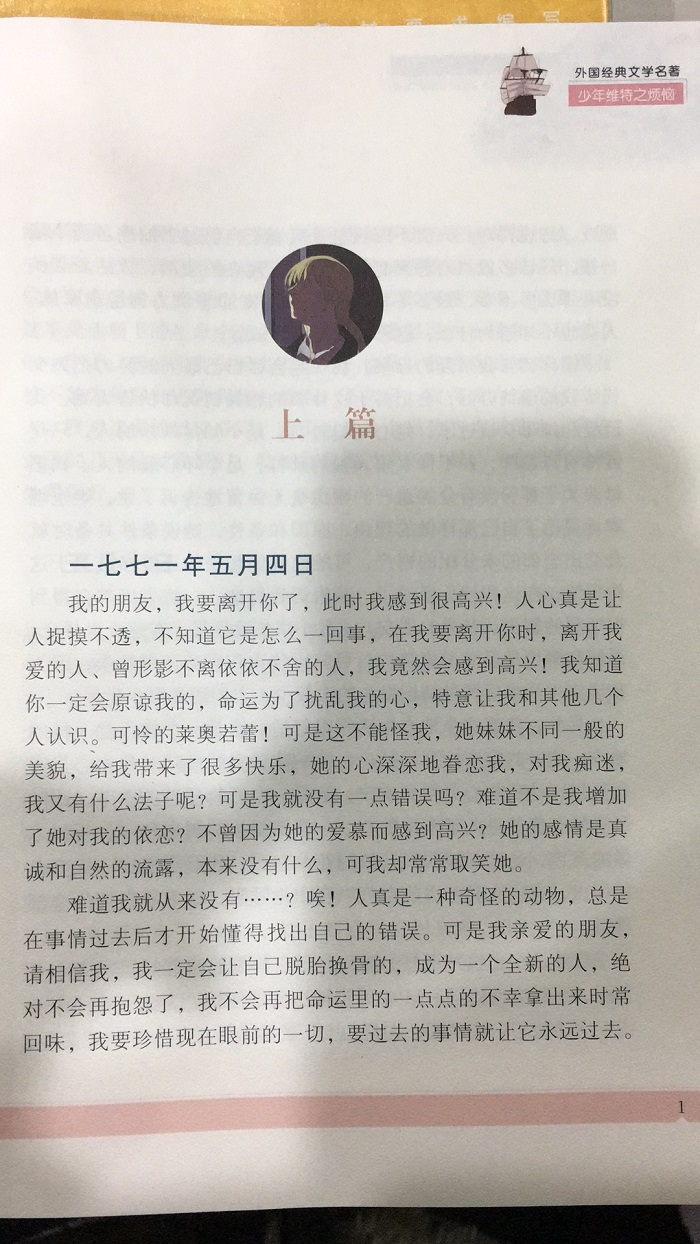 《少年维特之烦恼》是歌德用日记和书信 体写成的。小说描写进步青年对当时鄙陋的德 国社会的体验和感受,表现了作者对封建道德 等级观念的反应以及对个性解放的强烈要求: 少年维特爱上了一个名叫绿蒂的姑娘,而姑娘 已同别人订婚。爱情上的挫折使维特悲痛欲绝。
