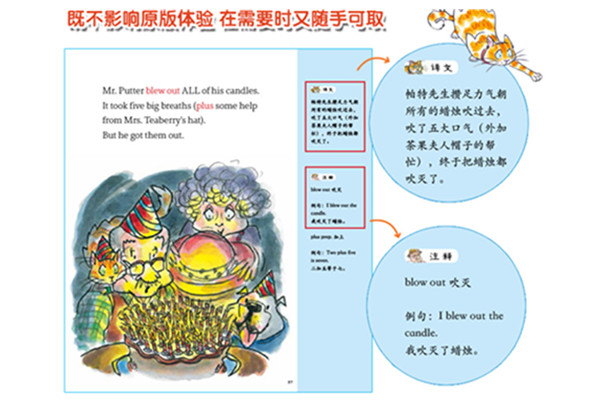 2、侧重于对7岁以上的小读者英语独立阅读能力的培养。本书精心策划设计,采用旁注的形式,将中文译文、地道短语标示及重点词句解析置于页面一侧,在不影响读者对于英文原文阅读的基础上,对文中的知识点进行补充和拓展。