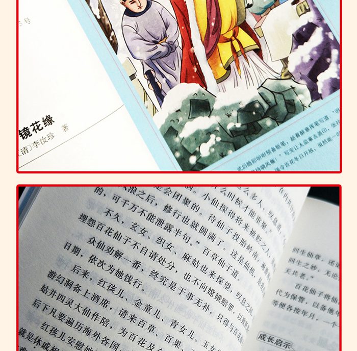 《镜花缘》前半部分写唐敖的海外游历入小蓬莱不返,小山海外寻父的故事;后半部写武则开科选才女,由百花仙子托生的小山及各花仙子托生的一百位才女皆金榜题名的故事。本书特色鲜明,融知识性、奇幻性、趣味性于一体,是一部具有较大创新意义的别开生面之作,被鲁迅称之为奇书。