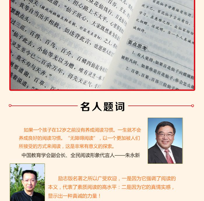 时常听家长说起孩子不愿意读名著。想过为什么吗?编者认为一是没有选到好书,翻译、编译差,字体小,错字多,无插图、枯燥乏味...... 二是孩子读不懂,没有人帮他们扫除阅读上的字词障碍、理解障碍,并和孩子互动讨论,帮孩子解答疑难。 本套丛书是专为中小学生编著,着重关注“素质成长”的励志版名著。所有的编排都是从阅读兴趣入手,就是为了让孩子愿意看,并能够很快地读进去。