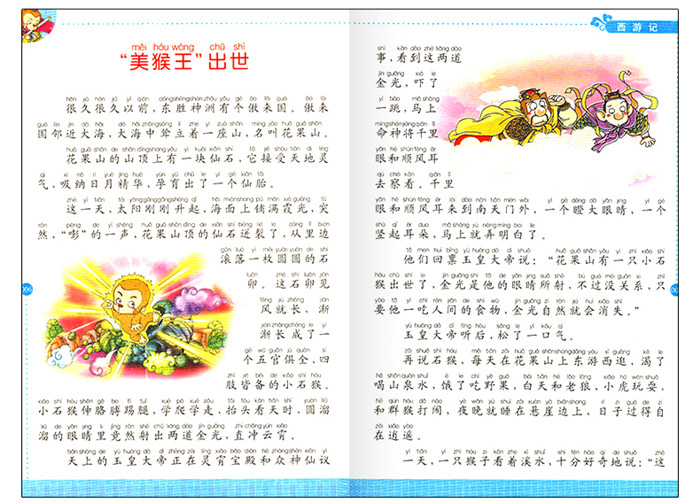 东胜傲来国有一花果山,山顶有一块石头,化为一只石猴。石猴求师学艺,得名孙悟空,学会七十二般变化。因为大闹了天宫,孙悟空被如来佛压在五行山下。五百年后,西行取经的唐僧救出孙悟空,并收了他做大徒弟。师徒二人西行,唐僧又收服了白龙成为自己的坐骑。后来认了猪八戒和沙和尚做自己的两个徒弟。师徒四人跋山涉水,打败了很多妖魔鬼怪,历尽千辛万苦,终于来到灵山圣地,拜见佛祖,取得真经。师徒四人把佛经送还大唐,真身又返回灵山,最终都享有封号,功德圆满。