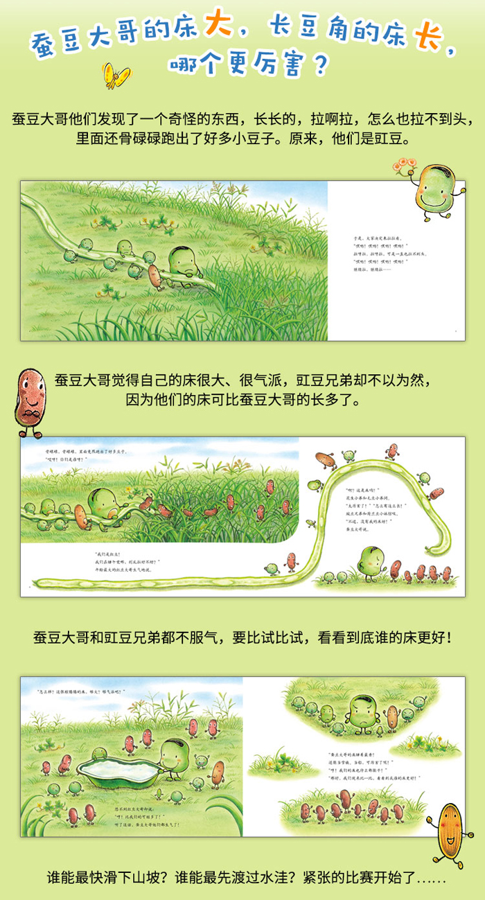 蚕豆大哥他们发现了一个奇怪的东西,长长的,拉啊拉,怎么也拉不到头,里面还骨碌碌跑出了好多小豆子。原来,他们是豇豆。蚕豆大哥觉得自己的床很大、很气派,豇豆兄弟却不以为然,因为他们的床可比蚕豆大哥的长多了。蚕豆大哥和豇豆兄弟都不服气,要比试比试,看看到底谁的床更好!谁能首先滑下山坡?谁能先渡过水洼?紧张的比赛开始了……