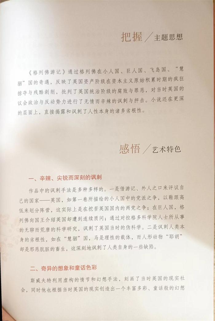 《格列佛游记》以格列佛四次出海航行的经历为线索,讲述了格列佛在不同国家所遇到的各种离奇的故事。第一卷:乘坐“羚羊号”,游历小人国。那里的人,身高不足六英寸。格列佛置身其中,就像一座巍巍大山一般。小朝廷里充斥着阴谋诡计、倾轧纷争。穿高跟鞋的一派与穿低跟鞋的一派互相攻击,势不两立。格列佛虽为利立浦特国立下了赫赫战功,但还是差一点被治罪,只好逃到另一个小人国。第二卷:乘坐“冒险号”,游览大人国。在大人国,格列佛这个在小人国里的“巨人山”,在那里就像田间的鼬鼠一样了。他被当作小玩意装进了小箱子里,带到各城镇表演展览,后来被卖入皇宫。国王召见他时,他慷慨陈词,赞美自己祖国的伟大,政治的贤明,法律的公正,却遭到国王的抨击和驳斥。第三卷:乘坐“好望号”,游飞岛国等。描述了格列佛在飞岛和巫人岛上的经历。飞岛上的人们奇形怪状,整天担忧天体会发生突变,因而惶惶不可终日。在科学院里,科学家们正在研究如何从黄瓜里提取阳光等。在巫人岛上,岛主精通巫术,擅长招魂,他把欧洲历史上的一些名人的灵魂招来给格列佛看。第四卷:乘坐“冒险号”,探秘慧骃国。在这个国度里,主宰者是具有高度智慧的马,而“人”却是野兽“耶胡”。马公