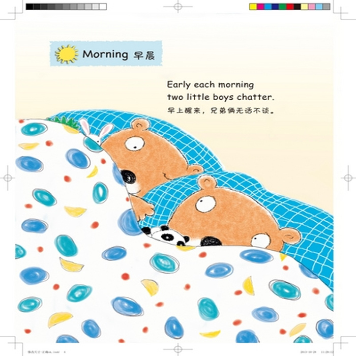 本书以一对双胞胎兄弟一天的生活为线索,讲述了不同场景下孩子们的不同状态,生动有趣,同时图画和文字中也展现出了父母陪伴孩子的快乐和辛苦 ,这样的主题十分贴近家长和孩子的心理,比较容易被读者接受。而就目前市场上的产品来说,多数局限在单一的场景去讲述孩子的一天,而这本图画书恰巧避免了这一点,转换了多个场景,另外本书以双胞胎为主人公,也更好的拓展了特定的读者群。