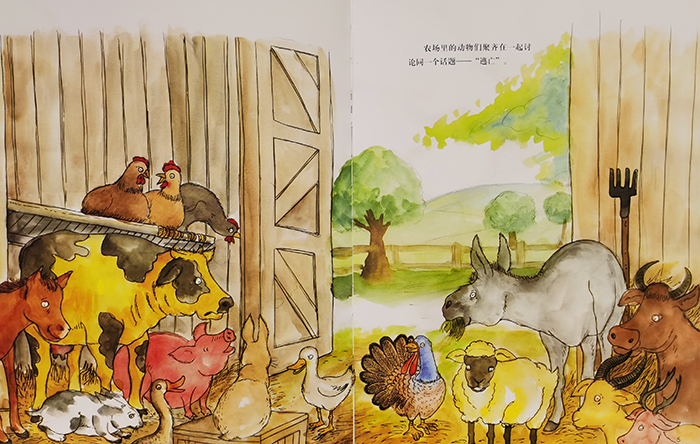 书中故事文字精简却充满着冒险精神,农场里住着各种动物,因为不甘心成天圈养在有限的空间里,生活也枯燥而乏味,甚至哪天会成为农场主的节日烤肉,它们越想越害怕,从而产生逃跑的想法。动物们紧张而有序地逃了出来,最后还是惊动了农场主夫妇,他们疯狂地跑出来想要阻止这些动物。