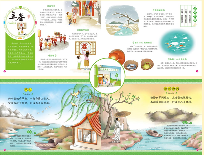 《诗情画意二十四节气》是一套送给孩子的美学启蒙书,一套4本。精装大开本,装帧很精美,印刷也不错。书中按照一年四季中二十四节气的时令特点,挑选适合孩子阅读的节气知识及古诗,一首古诗,一幅插画,具有清新的美感。不过度解读,能给孩子留下足够的想象空间。在清晨或午后,或睡前半小时,家长与孩子共读,能让孩子结合每个节气的时令特点,在缤纷的色彩中看绘画、懂时令、学古诗,同时体会生活的美好。书中附有时令介绍及每个节气的音频二维码,扫码即可免费聆听,给孩子美的熏陶。