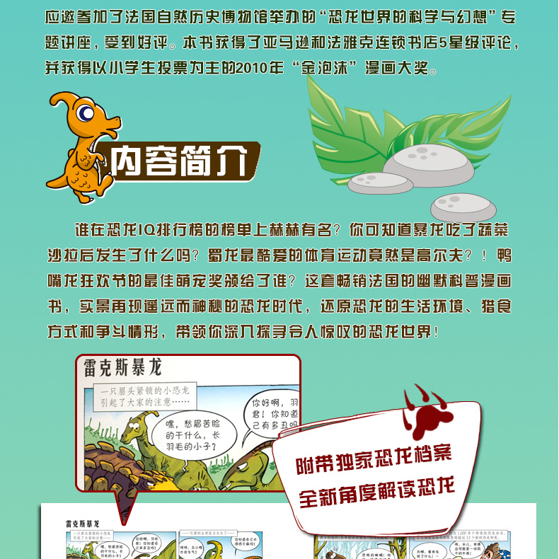 本书连载于法国著名的科普杂志《科学与生活》的儿童版。作者应邀参加了法国自然历史博物馆举办的“恐龙世界的科学与幻想”专题讲座,受到好评。本书获得了亚马逊和法雅克连锁书店5星级评论,并获得以小学生投票为主的2010年“金泡沫”漫画大奖。