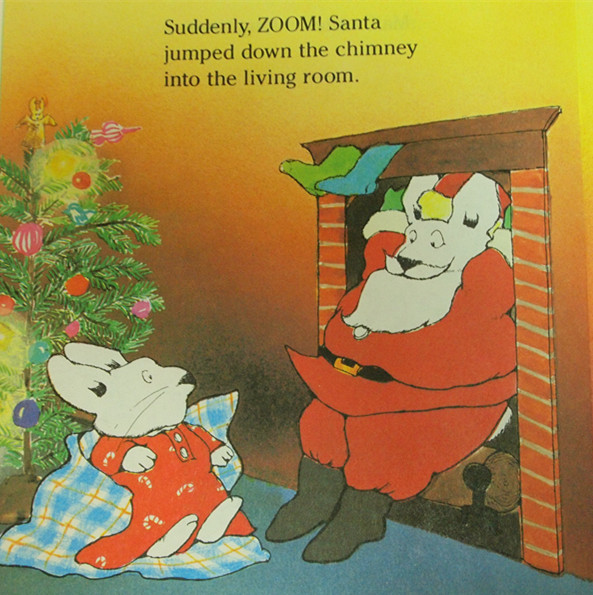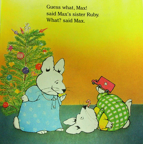 Guess what, Max! said Max'ssister Ruby. What? said Max.It's Christmas Eve, Max, said Ruby, and you know who's comiong! Who?said Max.Santa Claus in coming, that's who, said Ruby. When? said Max.