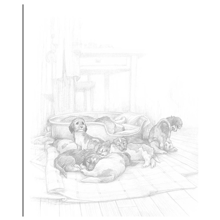 当来人指着小狗的某一个兄弟姐妹时,那只狗就会被大嗓门儿男人从狗篮里抱出来。人们会给大嗓门儿一些噼啪作响的纸,然后那只狗就被带走,再也不会回来了。这让小狗很难过,因为它不愿意像它们那样离开妈妈。所以每当有人来的时候,它都躲在妈妈身后。