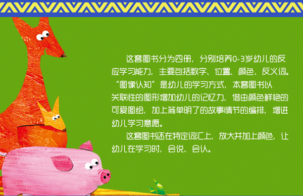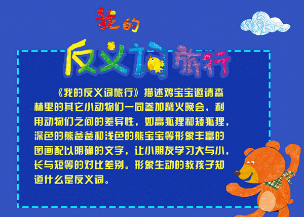 本书描述鸡宝宝邀请森林里其他的小动物一同参加营火晚会。利用动物们之间的差异性,如“高狐狸和矮狐狸带着礼物来了”,“深鉾熊爸爸带着浅色的熊宝宝来了”的文字叙述,再配合色彩层次丰富的图画,让小朋友一眼就以有看出动物之间的差别,马上就能理解什么是反义词。