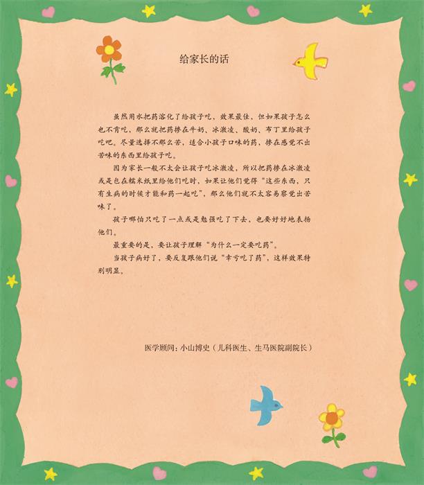 《呀,怎么变回来》在日本家喻户晓,后经日本著名儿科医生小山博史的审阅推荐,以专家的角度向家长提出了生病时让孩子吃药的注意事项(见本书*后《给家长的话》)。本书不但受到家长的欢迎,而且也成为幼儿园、儿童诊所、儿童体验场馆等场所的必备。