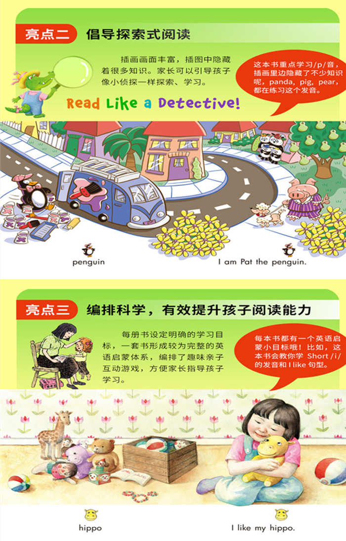 每册设有一个明确的学习小目标,每小套都是一个完整的英语启蒙体系;编排了操作性强的亲子阅读指导方案与有趣的小游戏,方便家长系统指导孩子学英语。