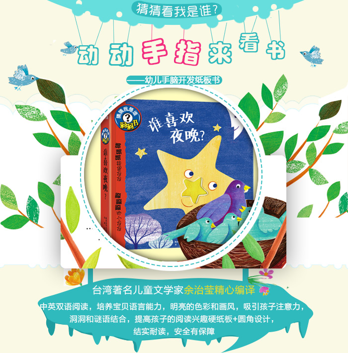 这套洞洞书专为培养幼儿的阅读兴趣而特别设计。书中通过生动有趣的文字,让孩子从提供的线索中,猜猜它是哪一种动物或物品。同时,各种埋下“伏笔”的图画,也可以看图猜物,找出正确答案。这种独特的阅读引导方式,不仅能激发孩子的好奇心和学习兴趣,更为今后的学习奠定了阅读基础。这本《谁喜欢夜晚?》向我们介绍了夜晚的景象。
