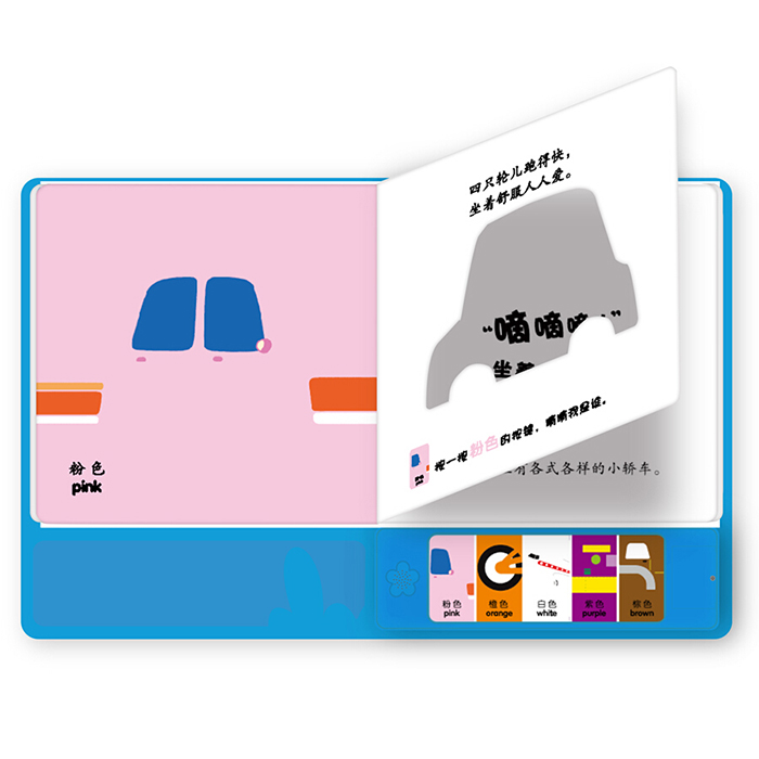 红、黄、蓝、黑、白等10个常见颜色,配合中英双语,让宝宝认知更全面;