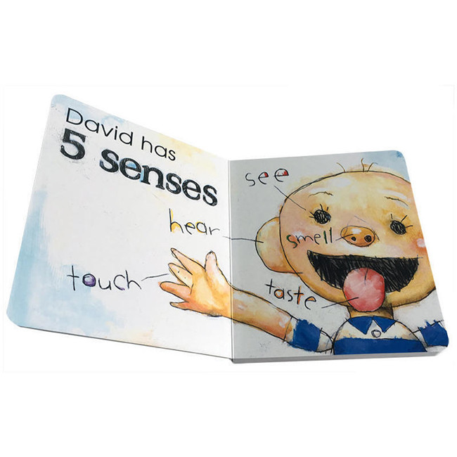 调皮的大卫正是好奇的年纪,看见小狗在睡觉,就想摸摸跟它玩Touch;看见地上的棒棒糖,就想舔一舔尝尝味道Taste;看见好玩的就玩得忘乎所以,回家才嗅到自己身上臭臭的Smell;