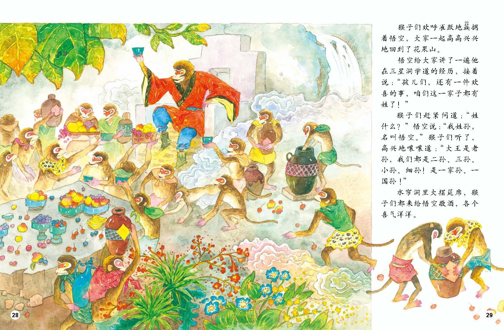 《花果山美猴王》:海外仙山上一颗圆圆的石卵里,蹦出了一只不寻常的小石猴。小石猴刚出生就会跑会跳,大家都说是神猴。一日,众猴聚会,小石猴发现水帘洞,当上了美猴王。美猴王又去海外仙山拜菩提老祖为师,学得一身好本领,还有了个名字叫“孙悟空”。