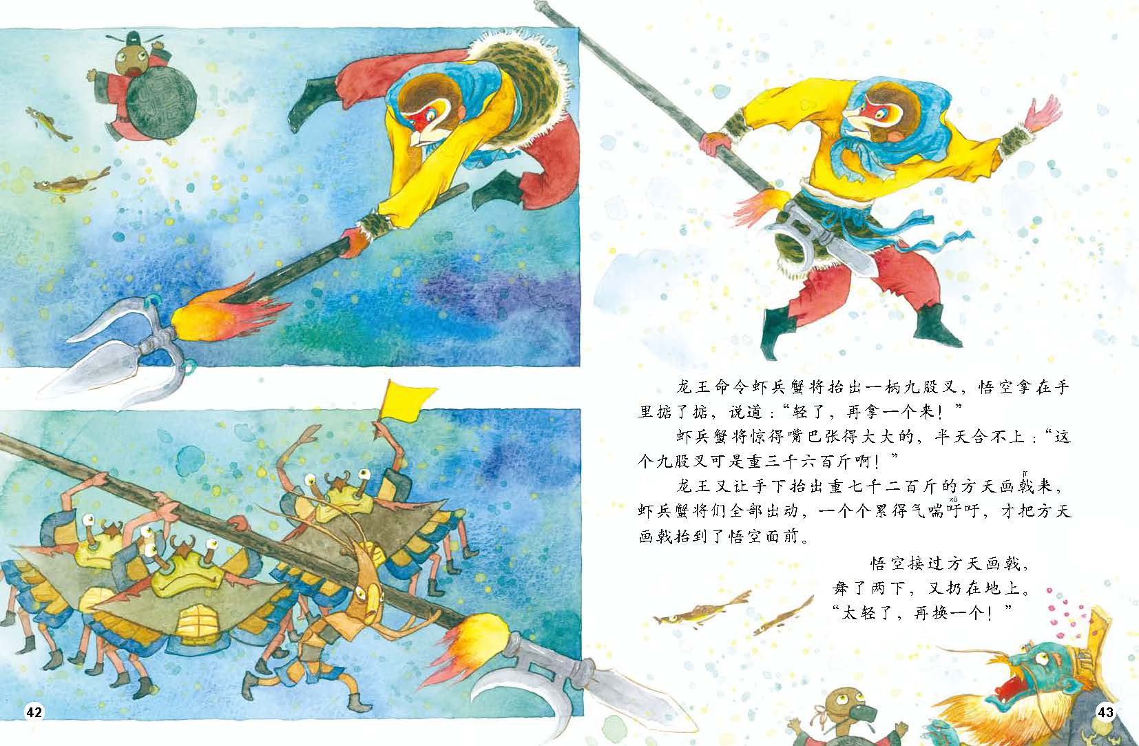 《猴王闯东海》:有了武艺,还得有兵器。美猴王入龙宫选兵器,得到了一根神奇的“如意金箍棒”,归来之后,演示给小猴子们看,满山小猴子欢呼雀跃。正高兴时,没想到来了一群天兵天将,要围攻花果山……