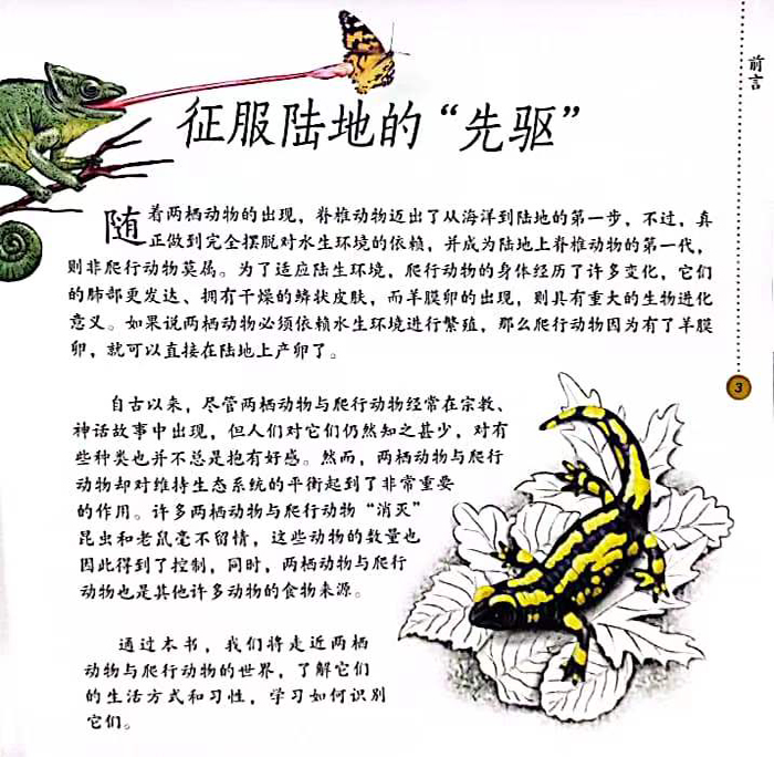 本书是“去野外:自然探秘百科”系列的分册之一。这套从书,知识全面,讲述角度符合儿童特点,是儿童对大自然的理解入手的科普童书。两栖动物走出了水中动物对陆地进行征服的第一步,之后出现了爬行动物,肺的出现和干燥的鳞片状皮肤,标志着爬行动物有了进一步的进化。很久以来,两栖动物和爬行动物并不被人们重视和喜欢,它们却是非常重要的动物。这本书将带领我们进入这个未知的而神奇的世界进行探秘,进而了解两栖动物和爬行动物的生活和行为方式,并且学习如何识别它们。