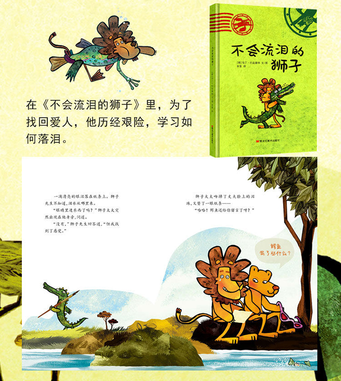 狮子先生很难过,可就是流不出眼泪。这时,鳄鱼来帮忙,他想出了各种办法,可狮子先生还是流不 出眼泪。*望的狮子先生回到家,看到山丘小树上有 一张纸条,读着,读着,他竟然流泪了。是谁留下的 纸条呢?是什么内容让狮子流泪了呢?……