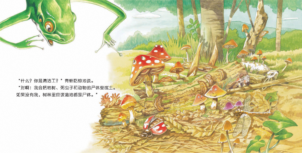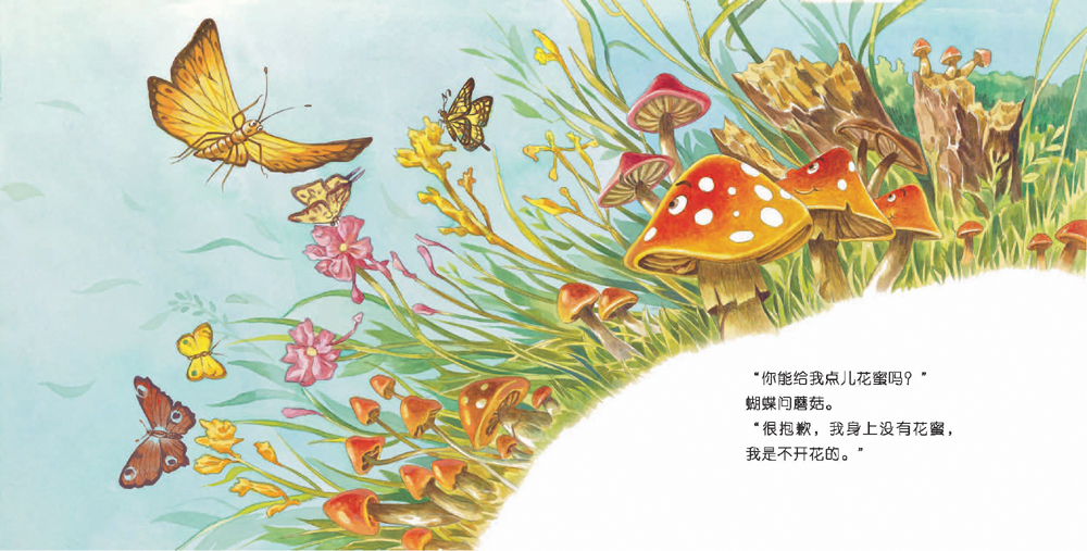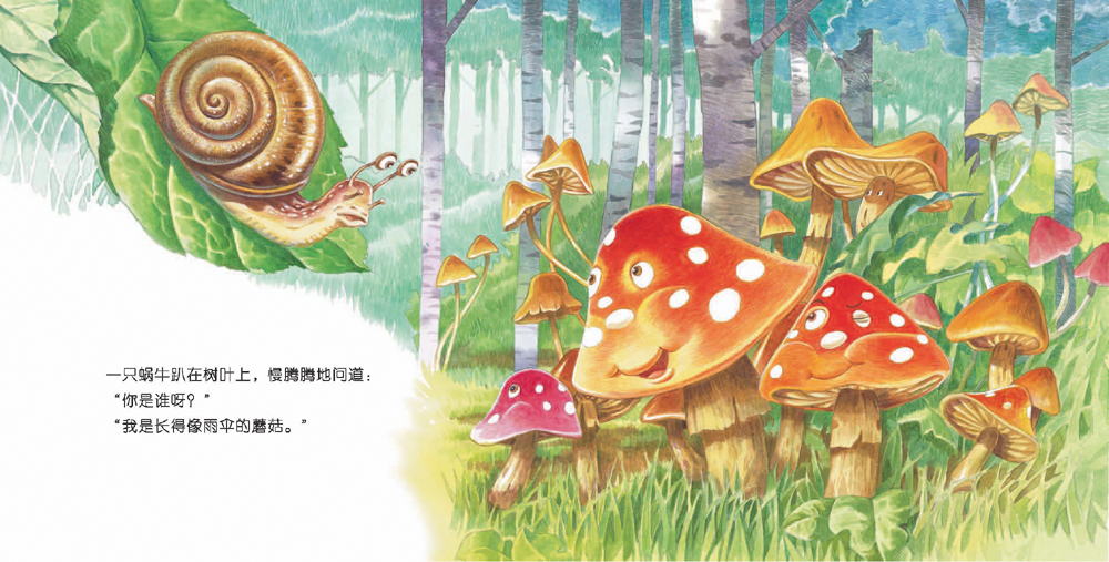 一只蜗牛趴在树叶上,慢腾腾地问道:“你是谁呀?”“我是长得像雨伞的蘑菇。”一只松鼠从旁边走过,他好奇地问:“你是谁呀?”“我是生长在枯树、死虫子上面的蘑菇。”“你能给我点花蜜吗?”蝴蝶问蘑菇。“很抱歉,我身上没有花蜜,我是不开花的。”……