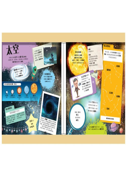 《太空》分为太空、太阳、月球、地球、内行星、外行星、太空旅行7个板块,用浅显的语言介绍了关于太空的基本知识,也介绍了恒星、行星、卫星等。从太空的大概念切入,介绍了我们熟悉的太阳、月球、地球等天体,紧接着对于太 阳系的行星作了分类和描述,最后讲了人类对于太空的探索。整本绘本能引发儿童对于浩瀚宇宙的向往,也解答 了他们对于太空相关知识的疑问。