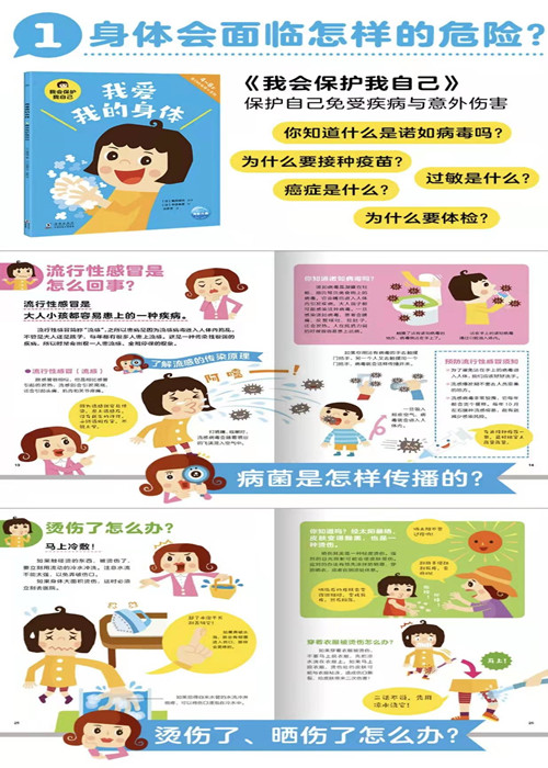 过敏是怎么回事?晒伤了、中暑了怎么办? 憋屎憋尿会怎么样?为什么不能把伤口上的痂抠掉? 为什么不能一直看动画片?为什么不能光吃零食呢? 《我爱我的身体》共3册,分册名分别为《我会保护我自己》《身体里的小秘密》与《如何养成好习惯?》。《我会保护我自己》介绍了生活中常见的疾病,如流感、诺如病毒和水痘,教孩子预防病菌的感染与传播,介绍烫伤、中暑等紧急情况的应对及处理等;《身体里的小秘密》介绍了消化系统、血液循环、呼吸系统以及支撑运动的肌肉和骨骼。《如何养成好习惯?》从饮食、运动、休息与清洁这四个方面,事无巨细地向孩子传递生活中的好习惯。 这套书用趣味十足的插画和简单的文字,解答孩子的疑问,让孩子了解身体的知识,告诉孩子哪些行为有利于健康,遇到疾病与伤害应当怎样处理,从“是什么”到“怎么做”,系统提高儿童健康素养,帮孩子打好一生的健康基础。