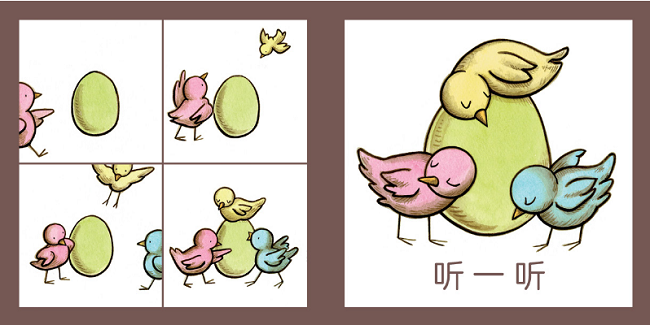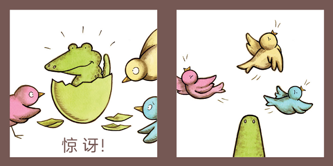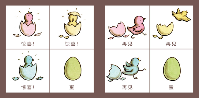 故事里有四颗蛋:一颗是蓝色的,一颗是粉色的,一颗是黄色的,还有一颗是绿色的。其中三颗蛋孵出来三只小鸟,小鸟们飞走了,只有绿色的蛋迟迟不见动静。三只小鸟又飞回来了。在小鸟们的帮助下,绿色的蛋终于裂开啦!然而意外的是,一只鳄鱼宝宝从蛋里钻了出来…… 《蛋》这本书用简短的词汇、漫画式的格子画面,讲述了一个以惊喜和悬疑为特色的故事,令人惊奇而惹人喜爱,是学龄前儿童早期阅读的完美之选,也非常适合课堂内小组阅读。