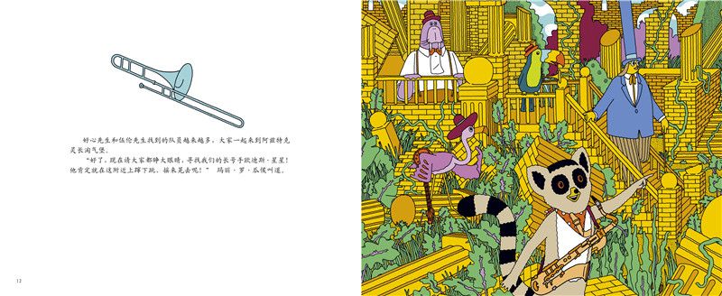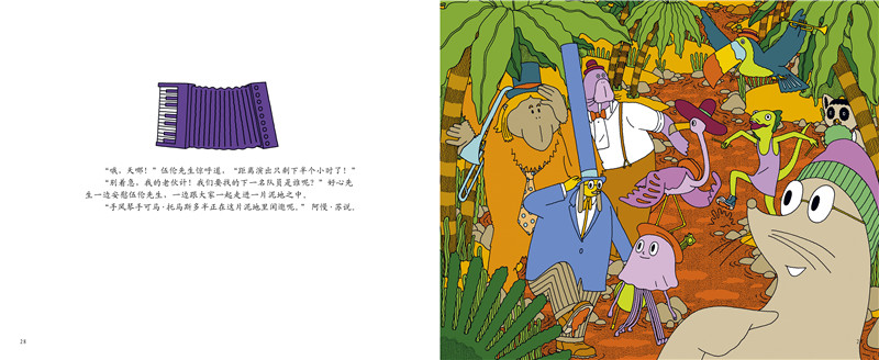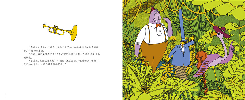 好心先生来到动物园,要去欣赏他*喜欢的动物爵士乐队的表演。走着走着,他遇到了动物爵士乐队的队长——海象伍伦先生。然而伍伦先生找不到他的队员了,需要好心先生的帮助。小号手隐藏在密林深处,萨克斯手隐藏在森林深处,鼓手藏进了爬行动物馆,低音提琴手藏进了极地馆……他要寻找的东西都隐藏在一幅幅非常丰富有趣的图画中,需要小朋友用心地寻找。
