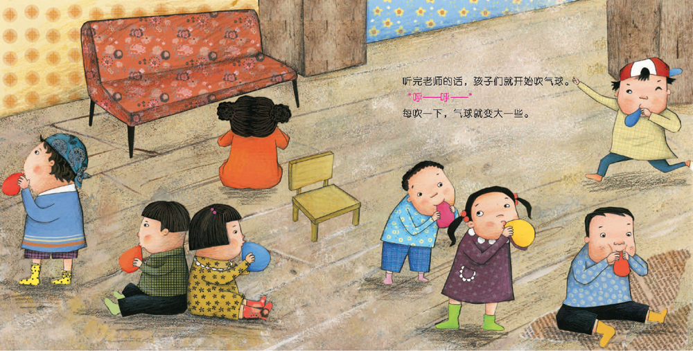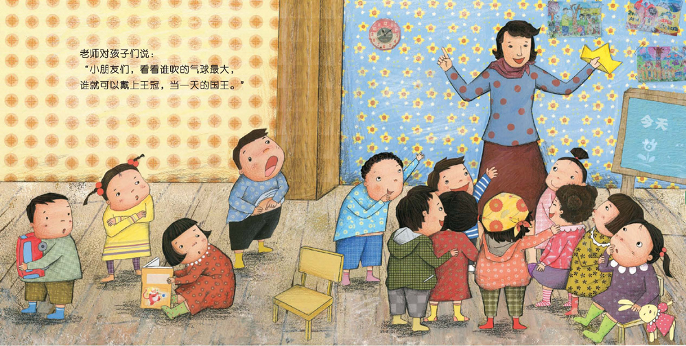 老师对孩子们说:“小朋友们,看看谁吹的气球最大,谁就可以戴上王冠,当一天的国王。”听完老师的话,孩子们就开始吹气球。 “呼——呼——”每吹一下,气球就变大一些。