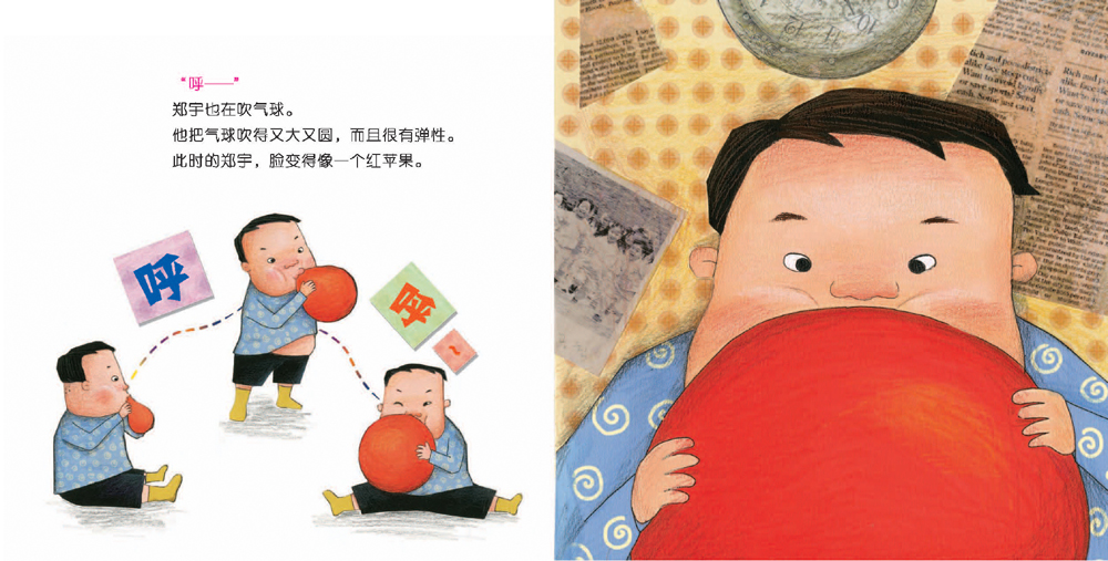 “呼——”郑宇也在吹气球。他把气球吹得又大又圆,而且很有弹性。此时的郑宇,脸变得像一个红苹果。小俊也在用力吹气球。“呼——呼——”空气一点一点地进入气球里面。……