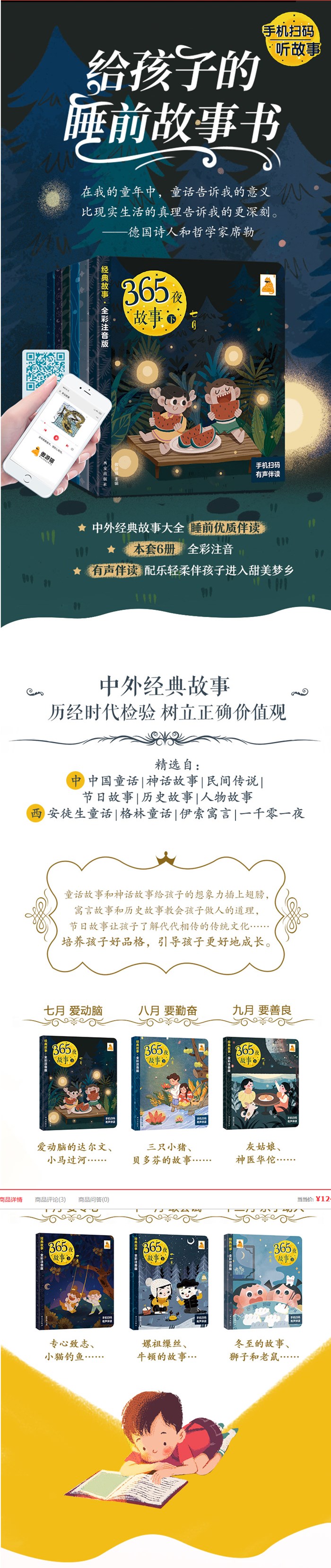 《365夜故事》是专门为3-9岁孩子设计的一套睡前故事书。该套书共两套,分别为《365夜故事 上》《365夜故事 下》。按照12个月划分,每套6册,全套12册。 书中收录的均是中外经典故事,涵盖童话故事、神话故事、节日传说、民间故事、历史故事、人物传记、成语故事、寓言8大板块,囊括孩子必读的中外经典;插画精美,不仅能给孩子美的阅读体验,还能在无形中培养孩子的审美;拼音标注,方便孩子自主阅读;丰富的主题,讲述积极正面的道理,培养孩子的好品质。